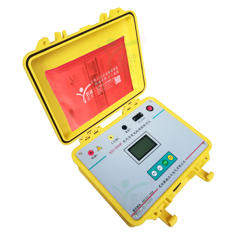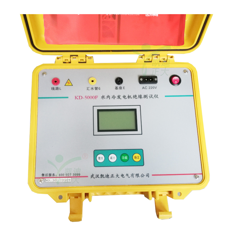 KD5000F水冷發(fā)電機絕緣電阻測試儀專用于水內(nèi)冷發(fā)電機的絕緣測量試驗,同時也可用于試驗室或現(xiàn)場做其它材料的絕緣測試,輸出電流大于40mA。輸出電壓最大5000V,可測高達100GΩ的絕緣電阻。內(nèi)含高精度微電流測量系統(tǒng)、數(shù)字升壓系統(tǒng)。只需要用一條高壓線和一條信號線連接試品即可測量。測量自動進行,結(jié)果由大屏幕液晶顯示,并將結(jié)果進行存儲。不需對水極化電勢進行補償調(diào)節(jié),機座與匯水管間的電阻小至3kΩ,也可保證測量準(zhǔn)確度,水阻大于80kΩ時,可保證測試準(zhǔn)確度。并自動計算吸收比(R60S/R15S)和極化指數(shù)(R10min/R1min),自動儲存15秒、1分鐘、10分鐘的絕緣電阻值。也可用于變壓器等其他電力設(shè)備的絕緣電阻測試。