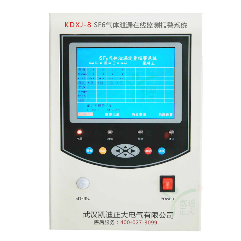 KDXJ-8 SF6氣體泄漏報警系統主要檢測環境空氣中SF6氣體含量和氧氣含量,當環境中SF6氣體含量超標或缺氧,能實時進行報警,同時自動開啟通風機進行通風,并具有溫濕度檢測、工作狀態語音提示、遠傳報警、歷史數據查詢等諸多豐富功能。