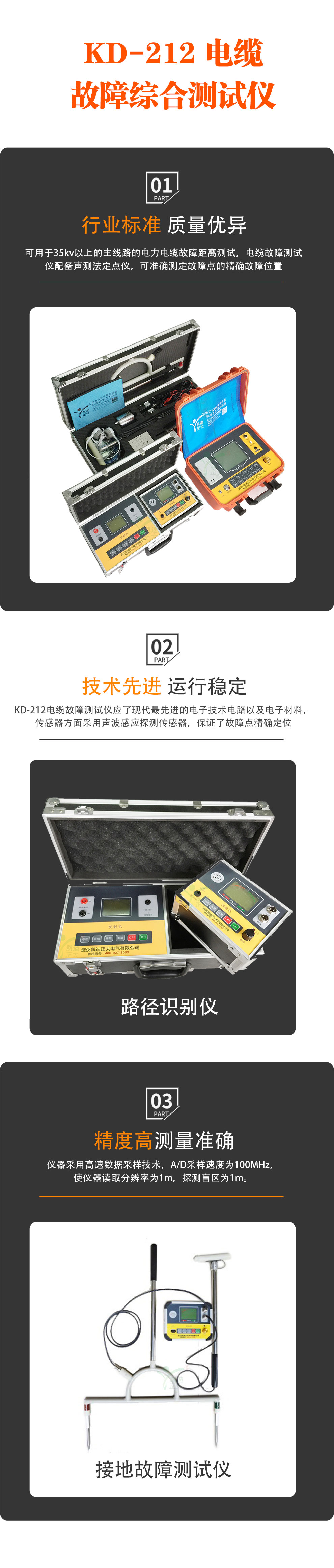 KD-212電纜故障測試儀能對地埋電力電纜故障、礦用電纜故障、通訊通信電纜故障、路燈電纜故障、高低壓電纜故障、直埋電纜故障、架空電纜故障中的開路、短路、閃絡放電故障、高阻泄漏故障、高阻閃絡故障,高低阻性的接地觸不良等故障進行綜合分析檢測。能對電纜故障點進行行波測量法、低壓脈沖法、脈沖電流法(直閃法、沖閃法)、弧反射法準確查找、定位等。是國內比較可靠的便攜數字式電纜故障綜合分析檢測儀器。電纜故障測試儀可用于35kv以上的主線路的故障距離測試,該電纜故障測試儀適用于測試各種型號、不同等級電壓的電力電纜及通信電纜。