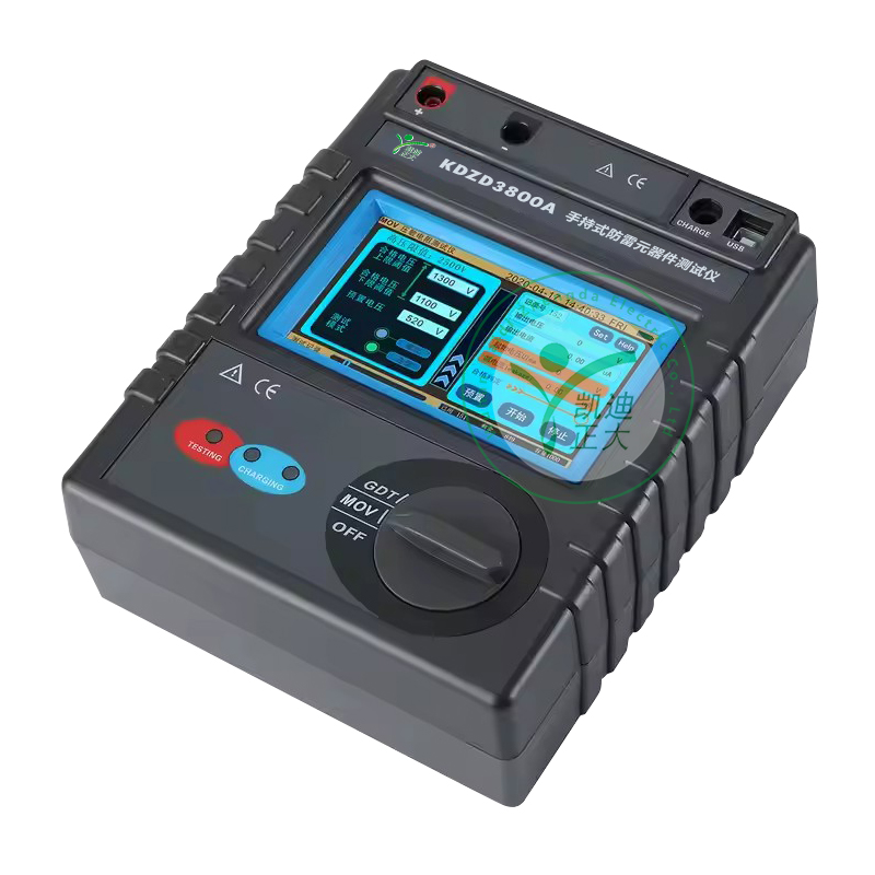 KDZD3800A 手持式防雷元器件測試儀采用觸摸彩屏中文界面,功能直達、一鍵測量、操作 簡易快捷,用戶無需費力記憶操作方法,點擊屏幕的“HELP ”即可彈出操作方法,有效指引用 戶操作儀表。同時儀表采用大容量可充電鋰電池、具有數據存儲功能,可自動存儲含有日期時 間的測試結果 3000 組、觸摸屏方便用戶查閱歷史記錄、USB 數據上傳導出等功能,還有自動關 機、電池電量低提醒等功能。