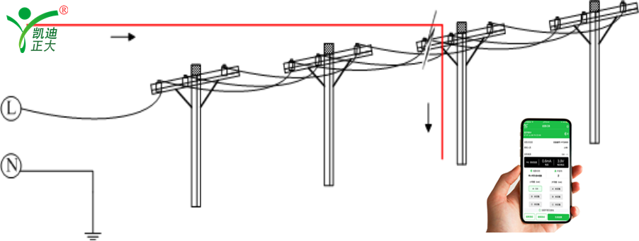 1.1.1定點:當確定故障區段后,主機輸出的信號將沿線路經故障點流入大地(如下圖),根據此特點即可采用二分法進一步定位故障。