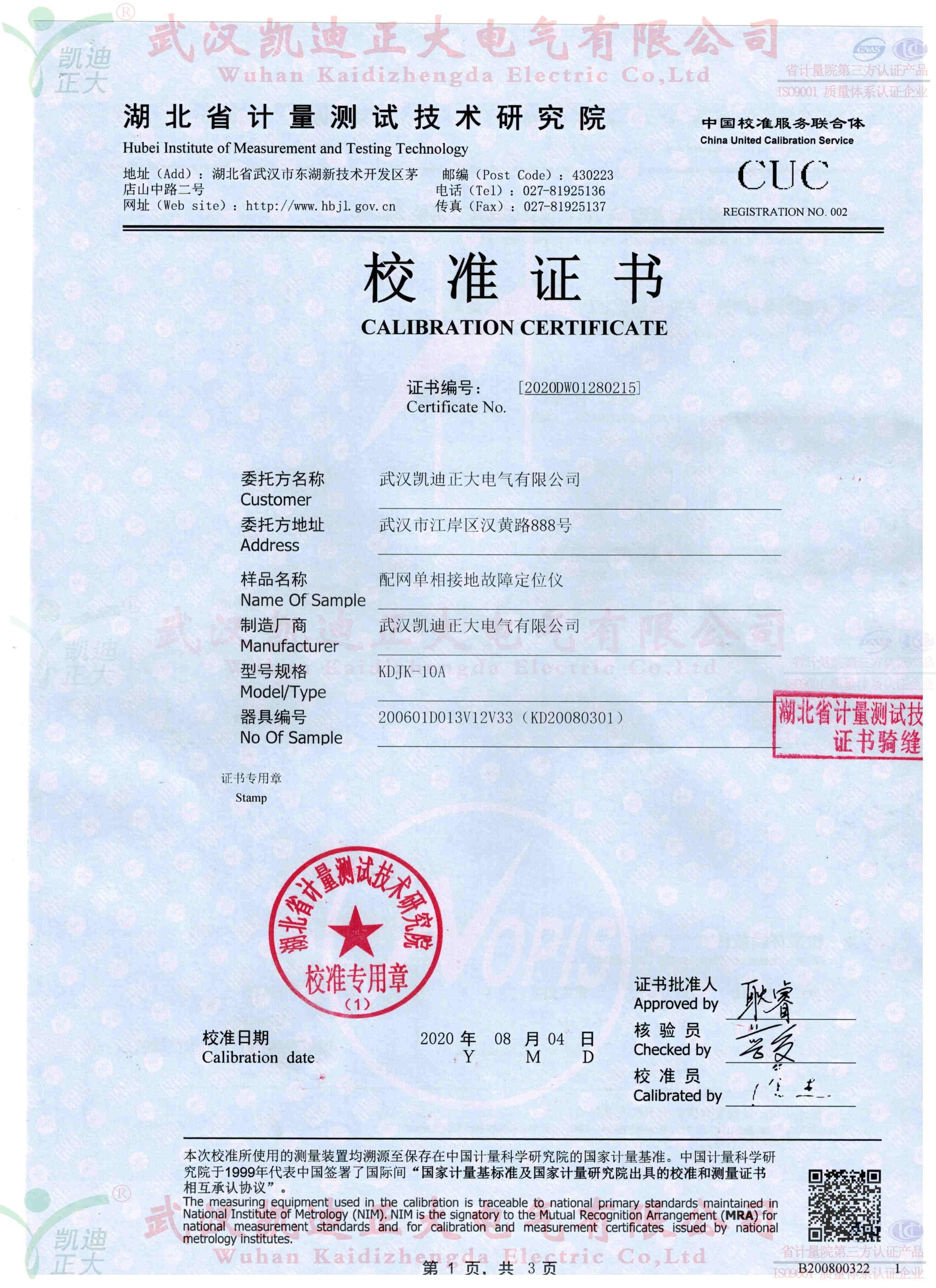 配網(wǎng)單相接地故障定位儀獲得省計量電學(xué)所校準(zhǔn)合格證書