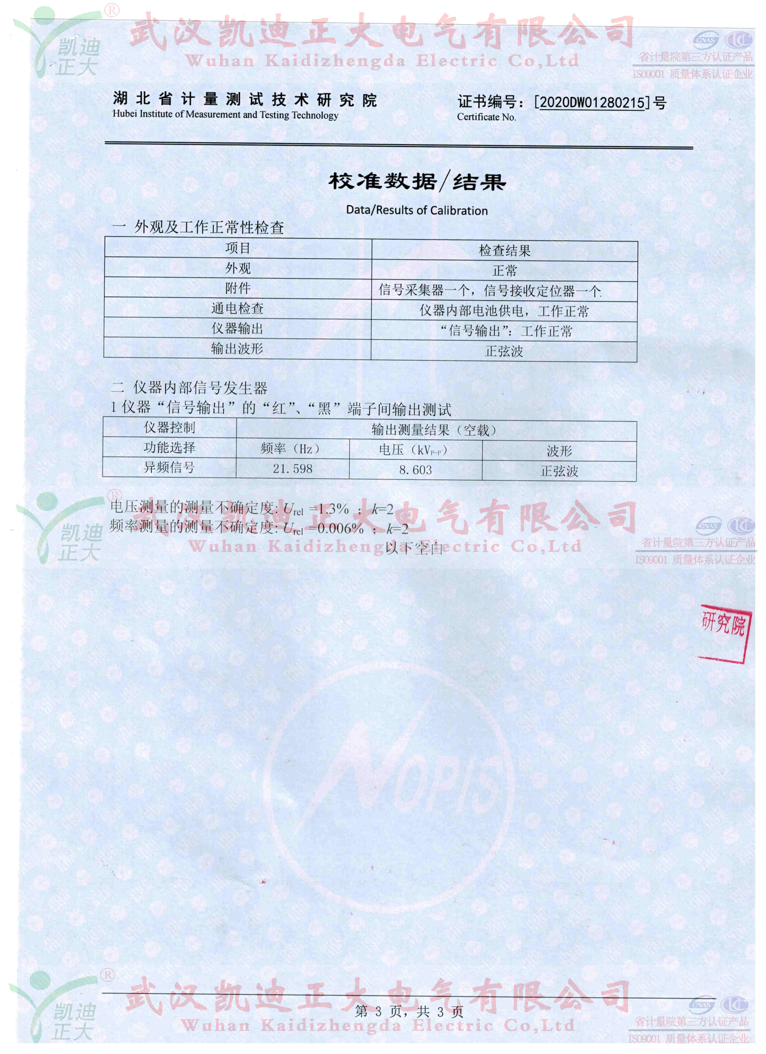 我司抽檢10套10kV配網(wǎng)單相接地故障定位儀送往湖北省計量測試技術(shù)研究院校準(zhǔn),獲得電學(xué)所檢測設(shè)備DS0S054A數(shù)字示波器標(biāo)準(zhǔn)設(shè)備的數(shù)據(jù):輸出波形正玄波、異頻信號21.598Hz、輸出電壓8.603kV、頻率測量的不確定度0.006%。符合武漢凱迪正大公司和國家電力規(guī)程標(biāo)準(zhǔn)。