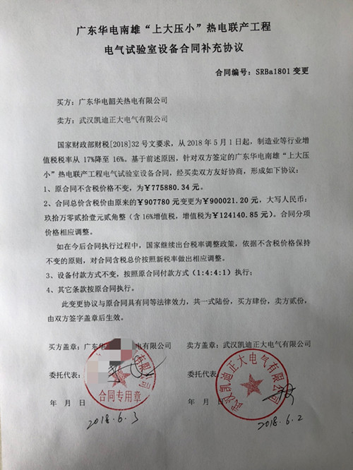 國家財(cái)政部財(cái)稅[2018]32號(hào)文要求,從2018年5月1日起,制造業(yè)等行業(yè)增值稅稅率從17%降至16%。基于前述原因,針對(duì)雙方簽定的廣東華電南雄“上大壓小”熱電聯(lián)產(chǎn)工程電氣試驗(yàn)室設(shè)備合同,經(jīng)買賣雙方友好協(xié)商,形成如下協(xié)議: