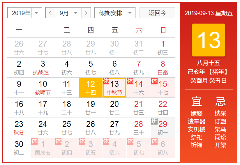 根據(jù)國務院2019年中秋節(jié)放假通知: