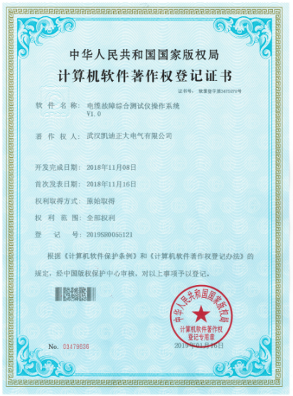 2019年,武漢凱迪正大電氣有限公司新力之作,榮獲中華人民共和國國家版權(quán)局《計算機(jī)軟件著作權(quán)登記證書》系統(tǒng)計算機(jī)軟件著作登記以及質(zhì)量管理體系認(rèn)證證書,其中包含電纜故障綜合測試儀操作系統(tǒng)V1.0(證書號:軟著登字第3475878號)、氧化鋅避雷器帶電測試儀操作系統(tǒng)V1.0(證書號:軟著登字第3478045號)、高壓開關(guān)動作特性測試儀操作系統(tǒng)V1.0(證書號:軟著登字第3478053號)、變頻串聯(lián)諧振耐壓試驗(yàn)裝置操作系統(tǒng)V1.0(證書號:軟著登字第3475581號)、電纜震蕩波局放定位系統(tǒng)操作系統(tǒng)V1.0(證書號:軟著登字第3475874號)等證書共計5份。權(quán)利取得方式:原始取得。權(quán)利范圍:全部范圍。