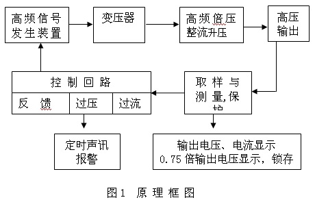 凱迪正大系列直流高壓發(fā)生器應(yīng)用最新電力電子技術(shù),采用高新的PWM調(diào)制技術(shù)及大功率MOSFET器件,通過中頻倍壓整流而成;該發(fā)生器具有紋波系數(shù)小、輸出穩(wěn)定可靠,體積小、重量輕的特點,且具有可靠、靈敏的內(nèi)部保護功能,其原理框圖如圖所示。