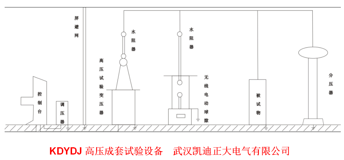 成套試驗設(shè)備(包括YDJ高壓試驗變壓器、KDYD控制臺、調(diào)壓器、以及球隙器、水電阻、分壓器和被試物)裝配聯(lián)結(jié)示意圖。
