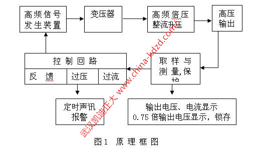 KDZG系列便攜式直流高壓發(fā)生器采用倍壓電路,率先應(yīng)用最新的PWM脈寬調(diào)制技術(shù),閉環(huán)調(diào)整,采用了電壓大反饋,使電壓穩(wěn)定度大幅度提高。該發(fā)生器具有紋波系數(shù)小、輸出穩(wěn)定可靠,體積小、重量輕的特點,且具有可靠、靈敏的內(nèi)部保護(hù)功能,其原理框圖如圖1所示。