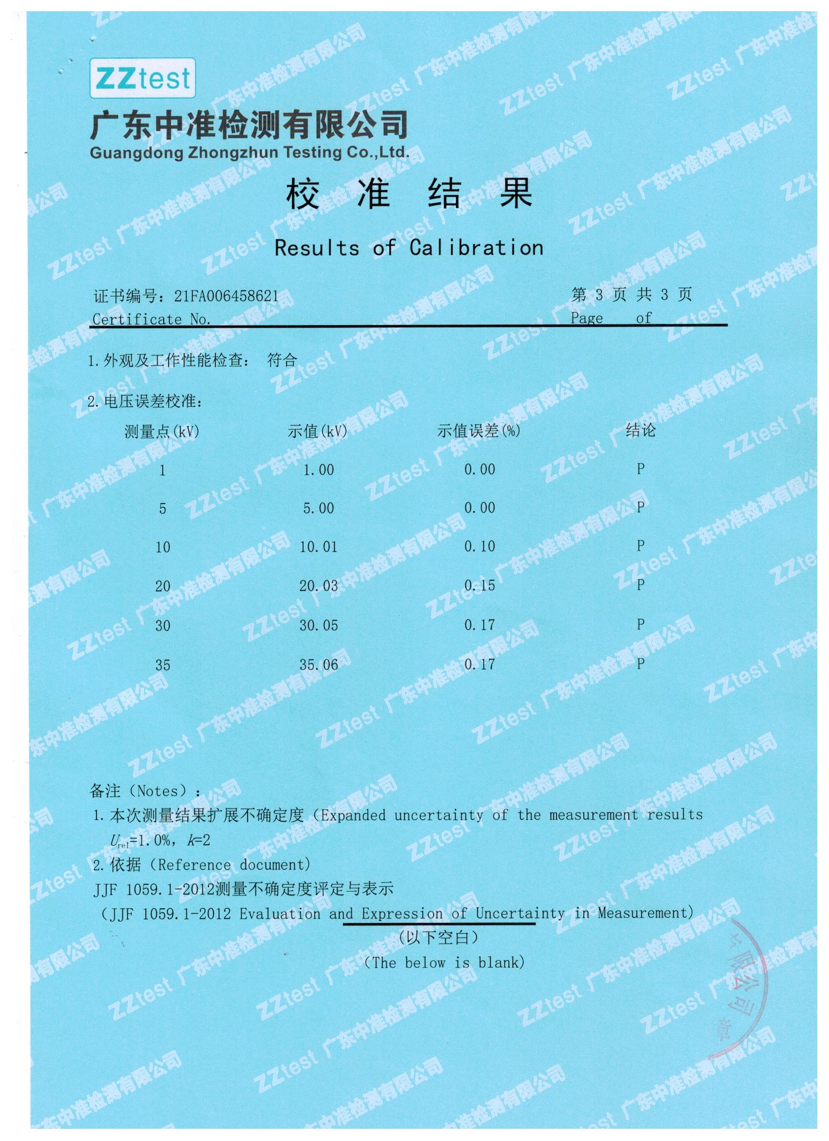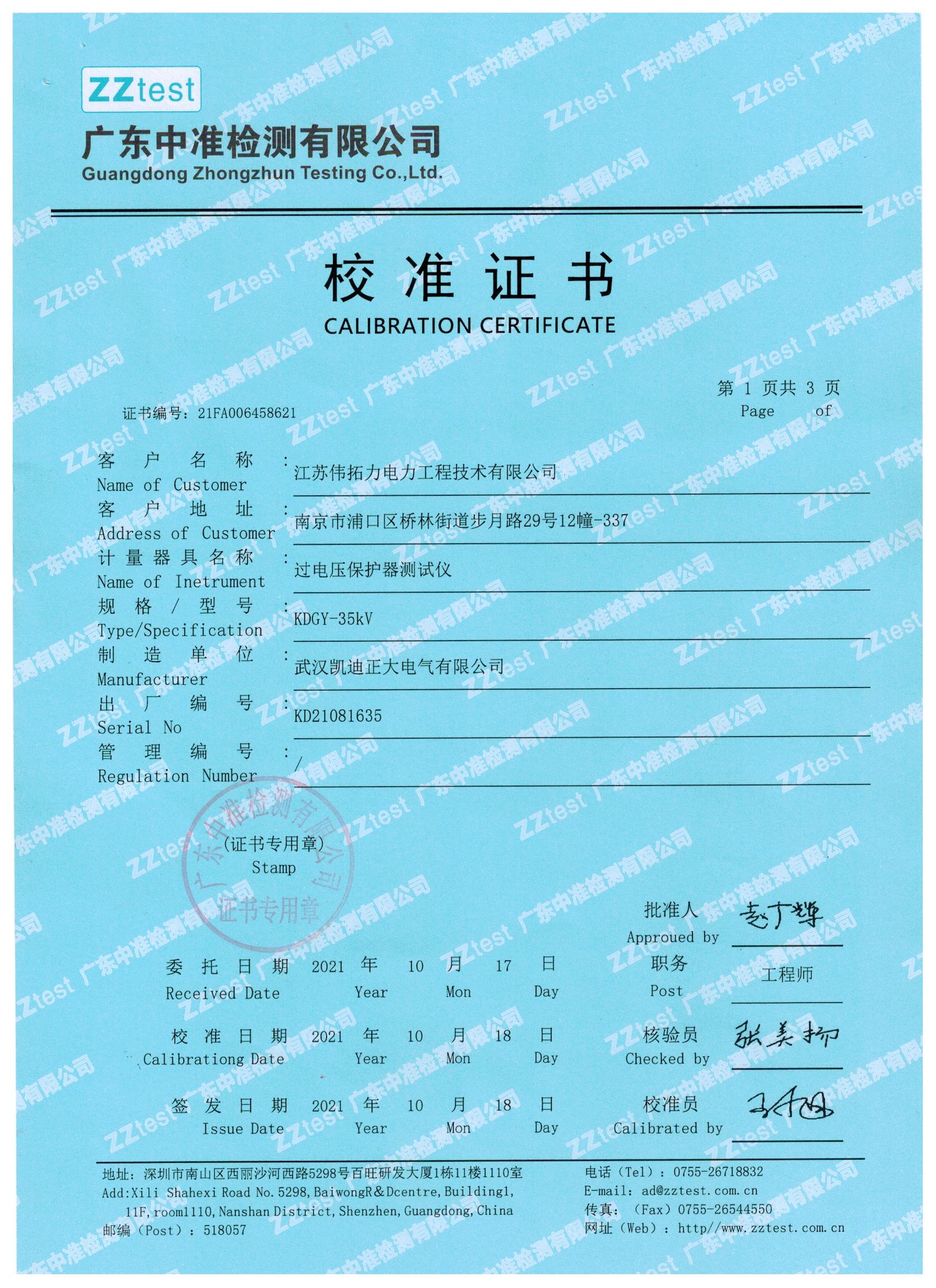 我們一直嚴把質(zhì)量關(guān),下面就是我們與江蘇偉拓力合作的過電壓保護器測試儀設備送檢結(jié)果