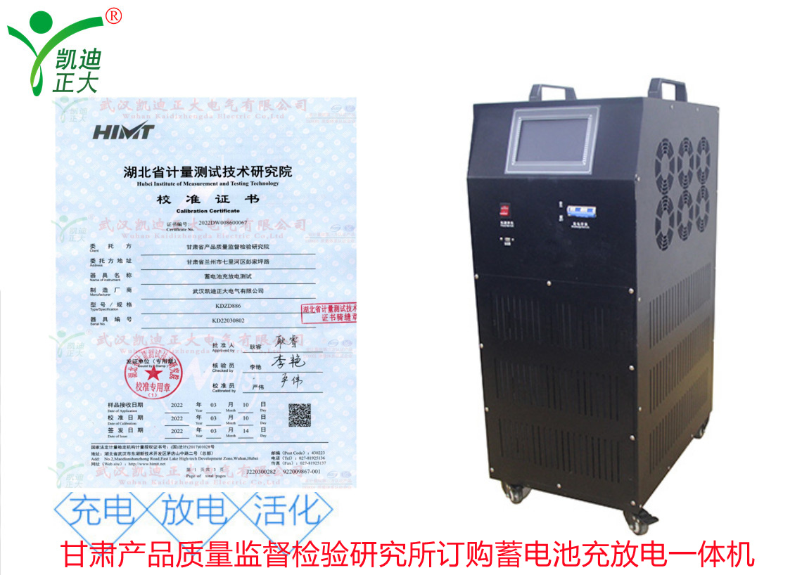 甘肅省產品質量監督檢驗研究院在了解我司KDZD886蓄電池充放電測試儀集蓄電池恒流放電,智能充電,活化于一體等功能。隨即采購KDZD886蓄電池充放電測試儀,要求獲得湖北省計量測試技術研究院的檢定合格報告。