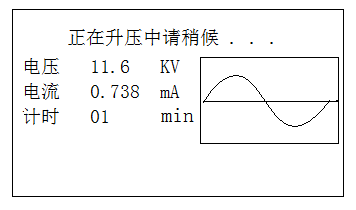 - 試驗電壓范圍為5KV至額定值。(請不要設小于5KV的試驗電壓),它規定了我們所要升至的試驗電壓。儀器升至接近這個設定電壓值時,就不再升壓,并保持在這個峰值下進行等幅的正弦波輸出。