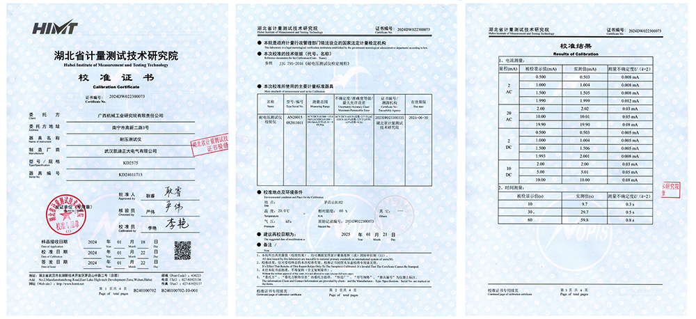 2024年1月25日,廣西機(jī)械工業(yè)研究院有限責(zé)任公司成功采購(gòu)了凱迪正大電氣的KD305A 絕緣電阻測(cè)試儀、KD2575 耐壓測(cè)試儀、KD2678 30A接地電阻測(cè)試儀、KDGK-F 開關(guān)特性測(cè)試儀等電力儀器儀表,均通過權(quán)威的湖北省計(jì)量測(cè)試技術(shù)研究院的嚴(yán)格校準(zhǔn)。