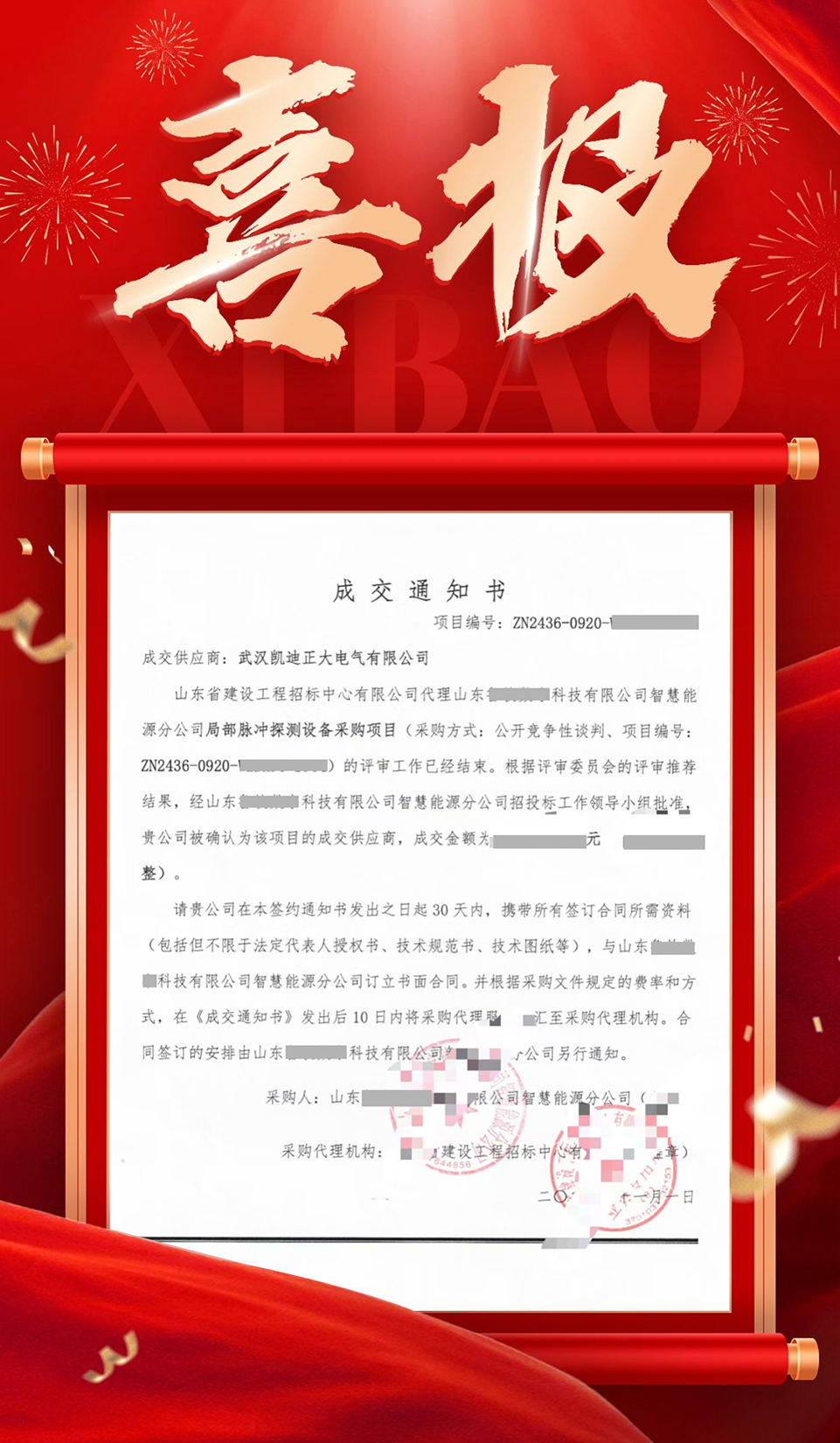 近日,國家電網有限公司電子商務平臺發布了“山東某數字科技有限公司智慧能源分公司2024年第七十二批物資類非招標采購項目中標公告”。武漢凱迪正大電氣有限公司成功中標局部脈沖探測設備采購項目。