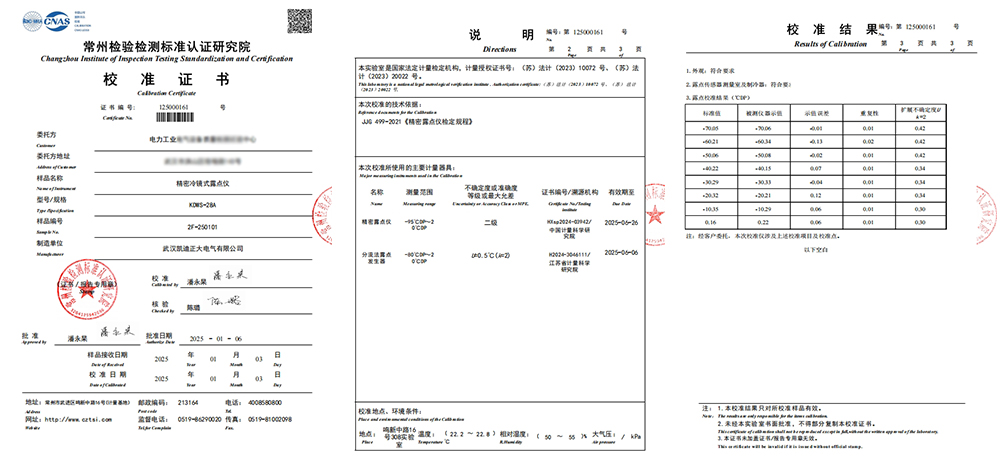2025年1月3日,武漢凱迪正大電氣有限公司的KDWS-28A精密冷鏡式露點儀,成功通過了常州檢驗檢測標(biāo)準(zhǔn)認(rèn)證研究院的嚴(yán)格校準(zhǔn),并榮獲校準(zhǔn)證書,標(biāo)志著該產(chǎn)品在工業(yè)氣體微水測量的可靠和精準(zhǔn)性。