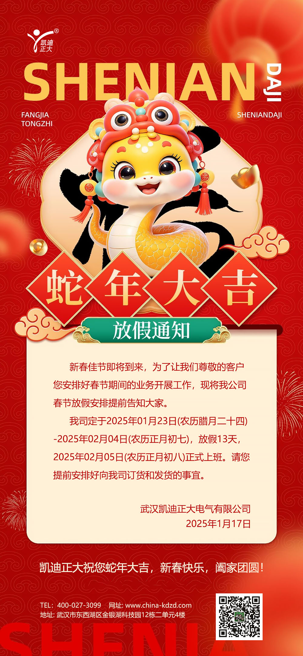 武漢凱迪正大2025年春節放假通知