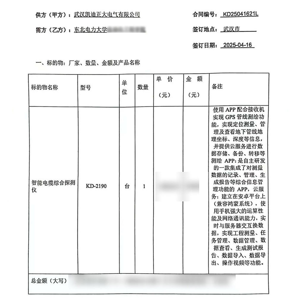 在眾多供應(yīng)商中,東北電力大學(xué)最終選擇了武漢凱迪正大電氣。這一選擇背后,是對(duì)武漢凱迪正大電氣多年來(lái)在電力行業(yè)積累的技術(shù)實(shí)力的認(rèn)可,更是對(duì)其產(chǎn)品在實(shí)際應(yīng)用中所展現(xiàn)出的可靠性、效率的信賴。武漢凱迪正大電氣以其專業(yè)的服務(wù)團(tuán)隊(duì)、完善的售后保障以及KD-2190智能電纜綜合探測(cè)儀的性能,贏得了東北電力大學(xué)的青睞與信任。